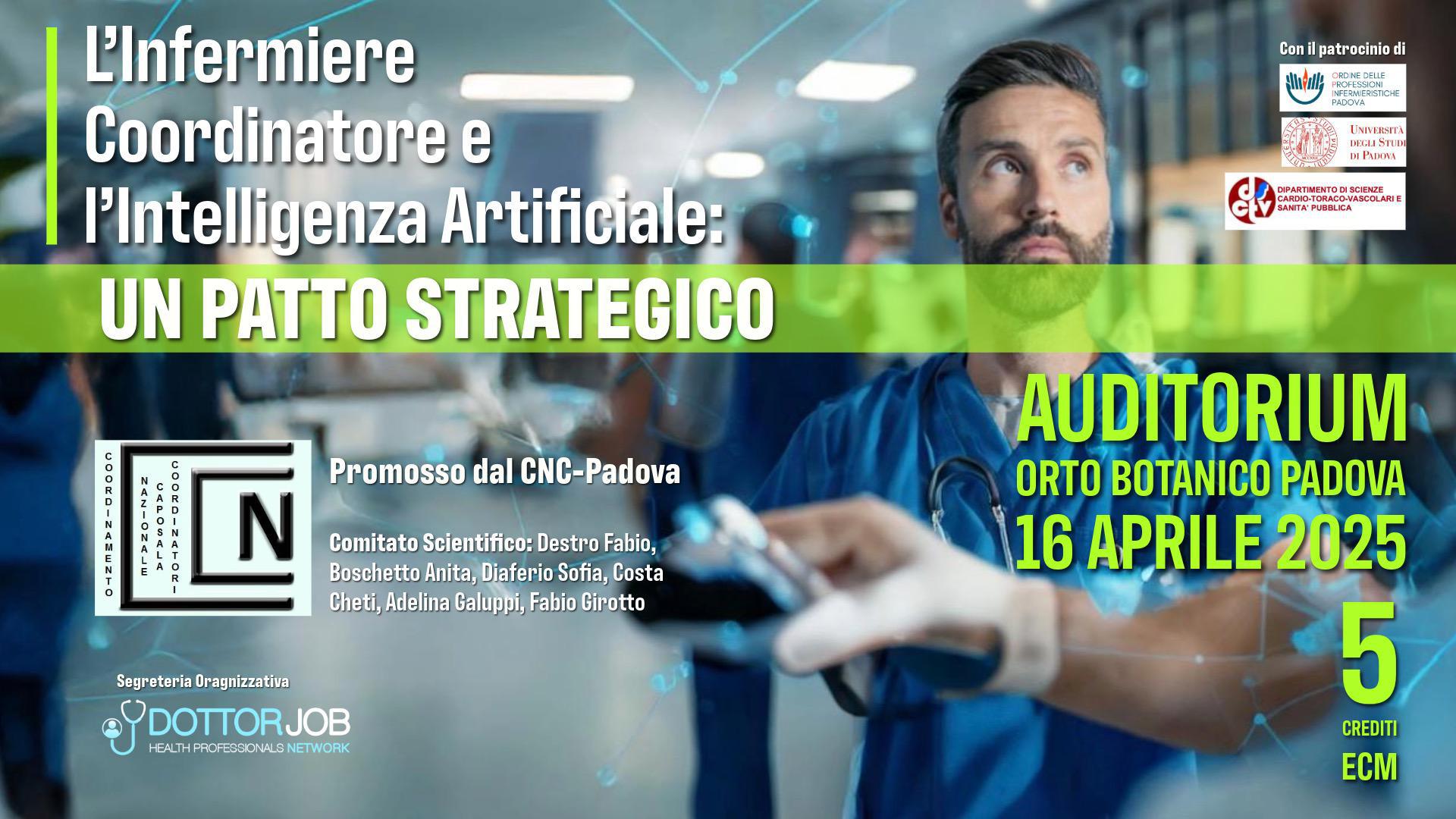 Il CNC Padova (Coordinamento Nazionale Caposala Coordinatori), in collaborazione con Dottorjob, è lieto di presentare il corso "L'infermiere coordinatore e l'intelligenza artificiale: un patto strategico", un'opportunità formativa di alto livello dedicata a tutti gli infermieri coordinatori che desiderano acquisire competenze avanzate nell'ambito dell'Intelligenza Artificiale (IA) applicata al settore sanitario.